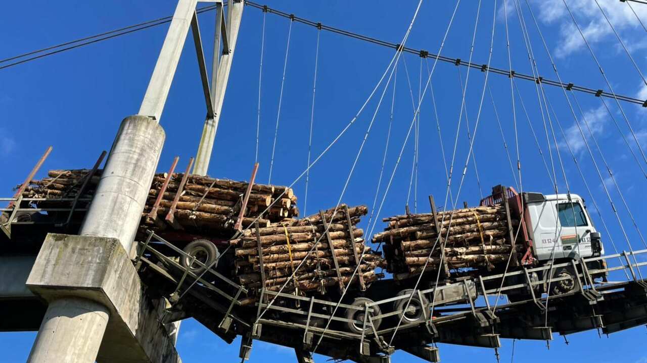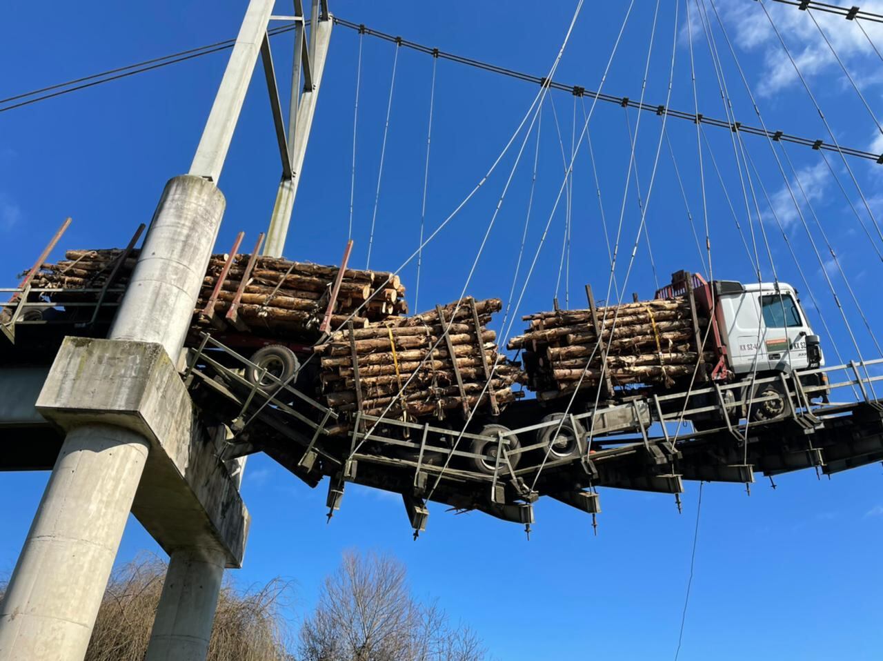 Impactantes son las imágenes de un camión que transportada madera y quedó en medio del puente colgante Quillem, en Carahue, región de La Araucanía.