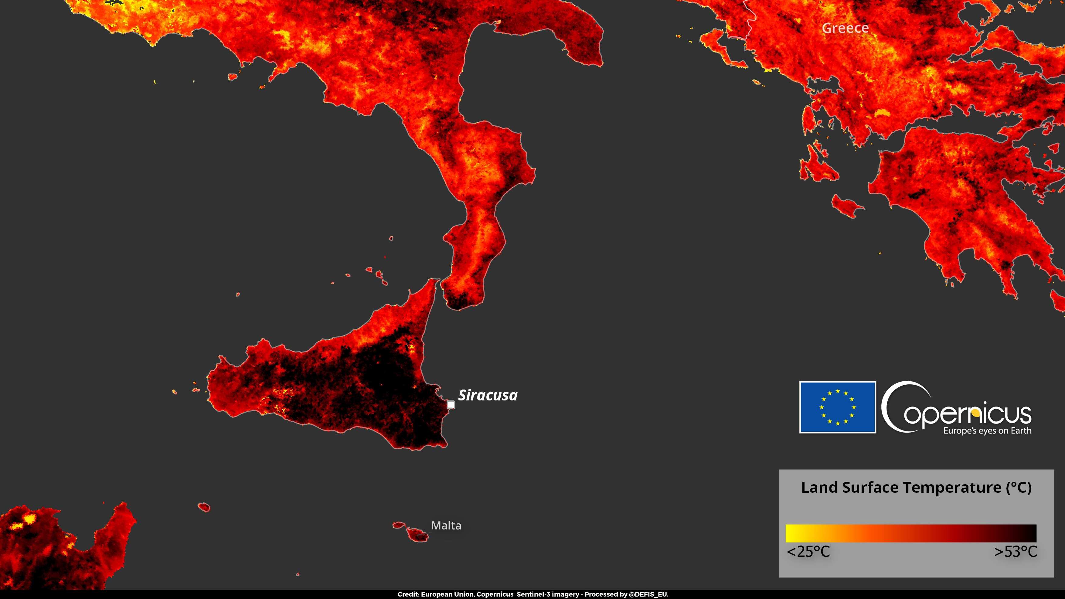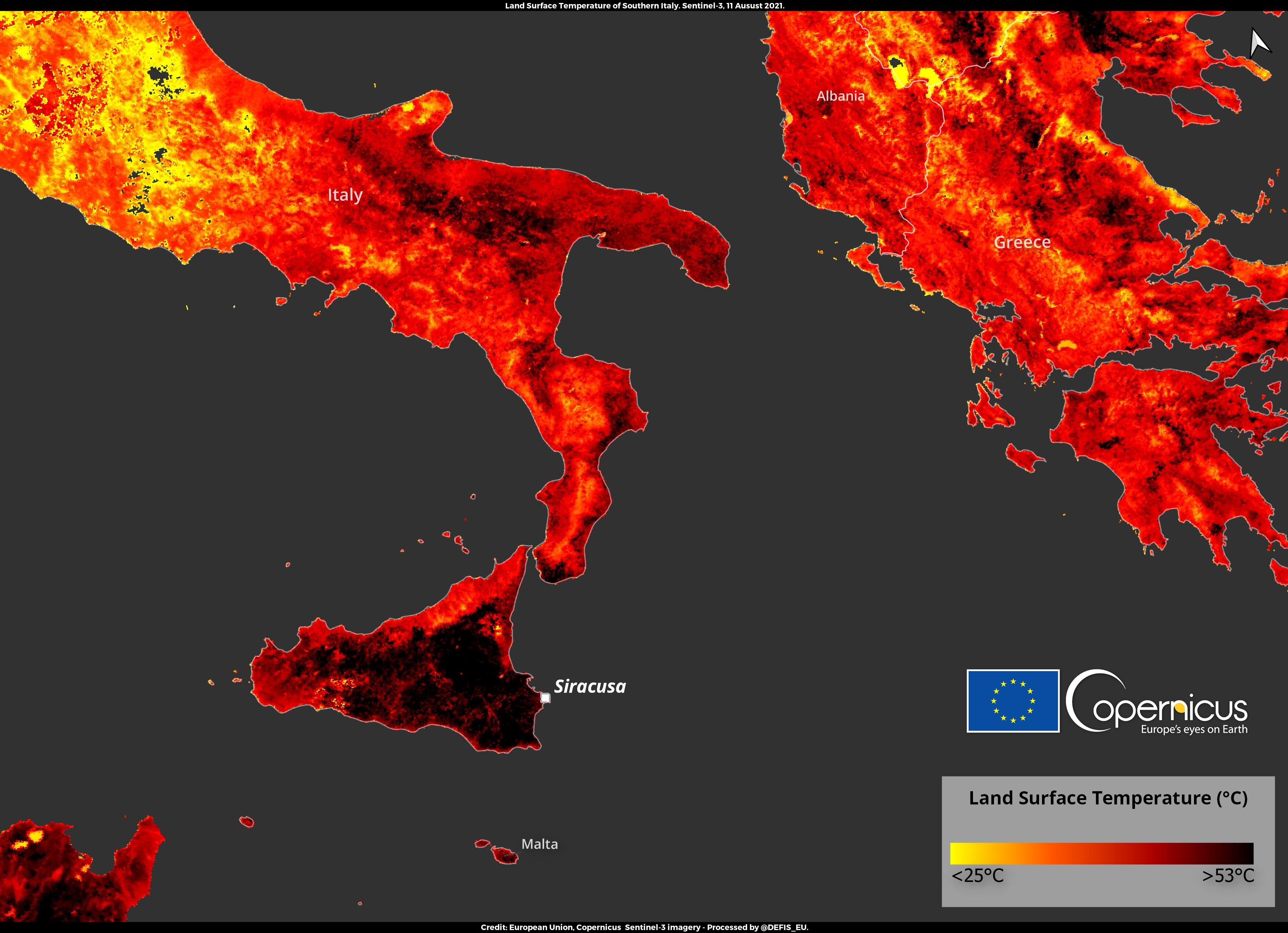 Según informó el Servicio Informativo Agrometeorológico (SIAS) de Italia, el pueblo de Floridia, de unos 21 mil habitantes, ubicado en Siracusa en la isla de Sicilia, llegó a una máxima de 48,8ºC.