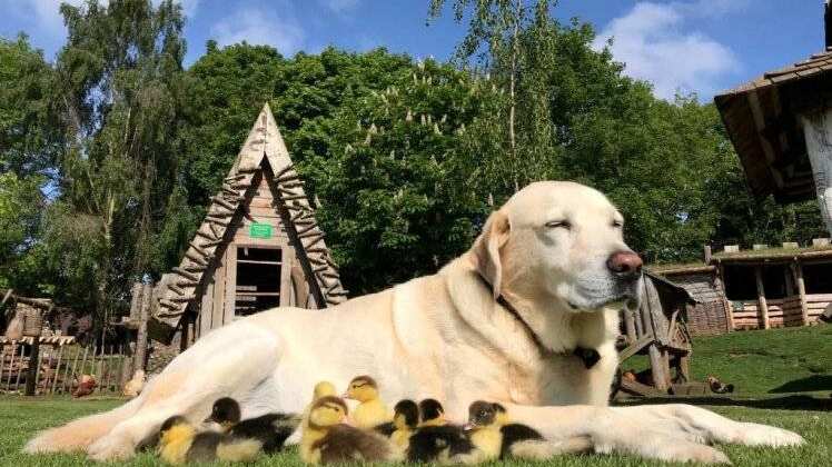 Este labrador de 10 años vio a los patitos y de inmediato sacó a relucir su lado paterno, convirtiéndose en el protector de ellos.