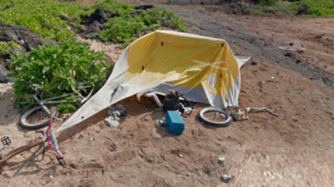 Esta casa de campaña había sido arrastrada por fuertes vientos con el hombre dentro de ella, lo que hizo que todas las pertenencias de este desafortunado campista terminaran destruidas y tiradas por todas partes. Incluso podemos ver cómo su bicicleta tiene daños irreparables.