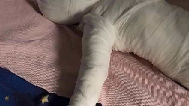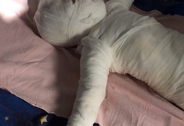En las fotos se ve al niño de menos de un año acostado en una cama del recinto hospitalario con su cuerpo cubierto de vendas.