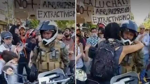 «Durante una procesión en la capital, en la intersección de la Avenida Providencia y Miguel Claro, un manifestante se acercó a un soldado lloroso y lo abrazó, mientras que otros cerca de ella le estrecharon la mano a otro soldado», agrega.