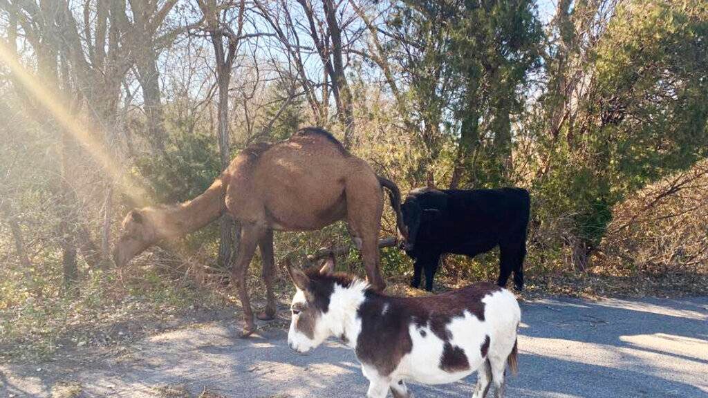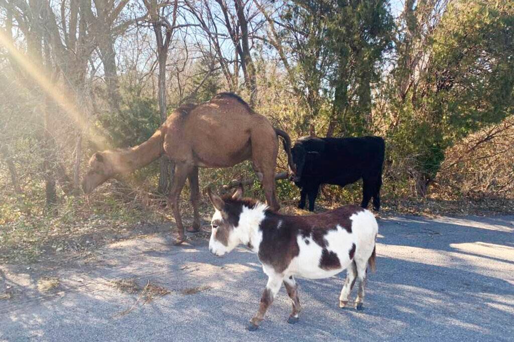Un camello, una vaca y un burro fueron vistos juntos recorriendo un camino en Kansas, en una escena que hizo pensar en la época navideña.