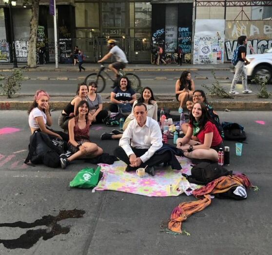 En la imagen se ve a la autoridad de la PUC en una especie de improvisada reunión junto a un grupo de jóvenes, generando diversas opiniones.