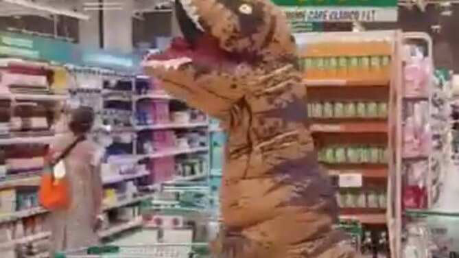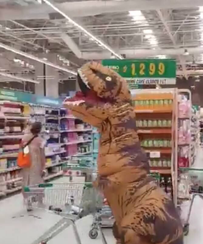 Increíble traje anticorona virus, hoy en el Jumbo. Cuando cachó que la grababan corría con el carro sacando sus productos. 🤣 ella toda seria se puso su traje de dinosaurio. pic.twitter.com/sx50uxXUxh