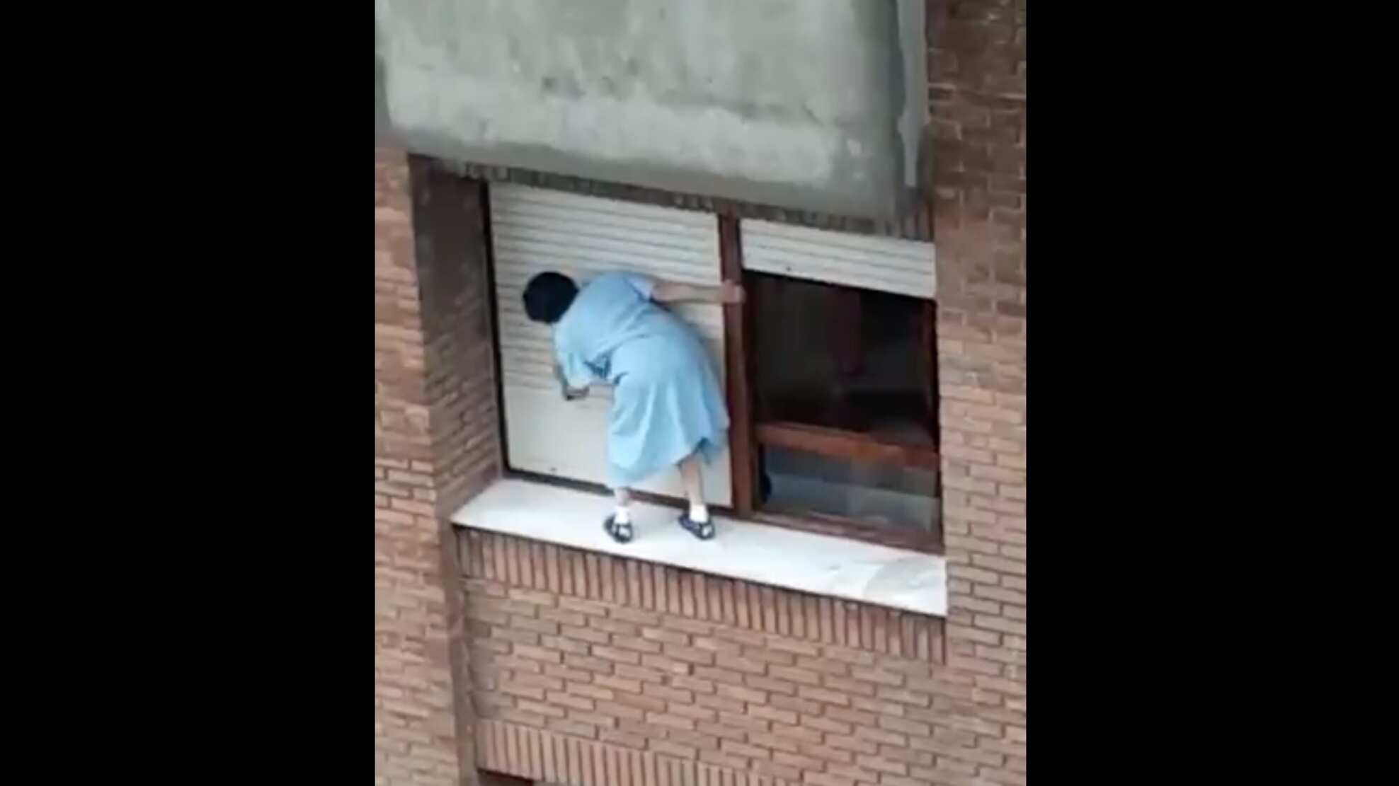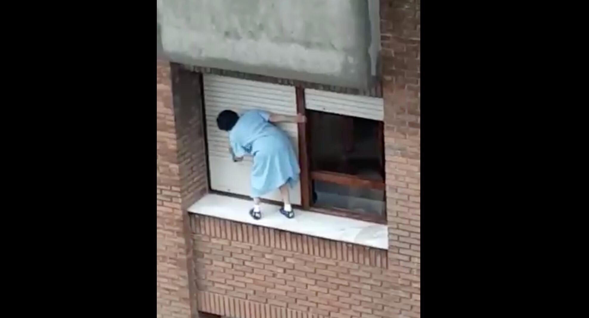 En el registro se ve como una mujer en bata y zapatillas limpia sus ventanas por fuera durante más de un minuto en el último piso de su edificio.