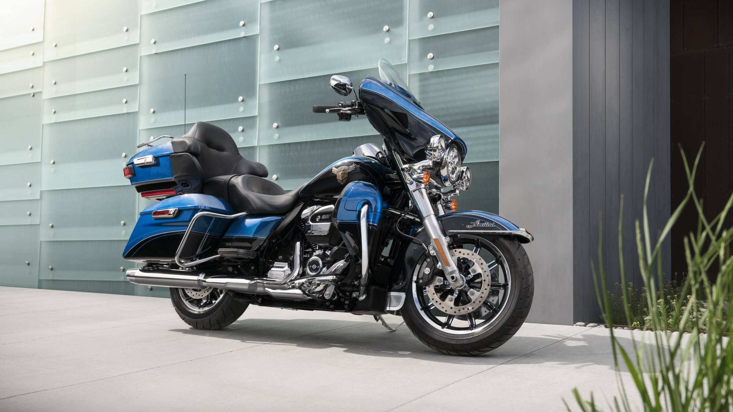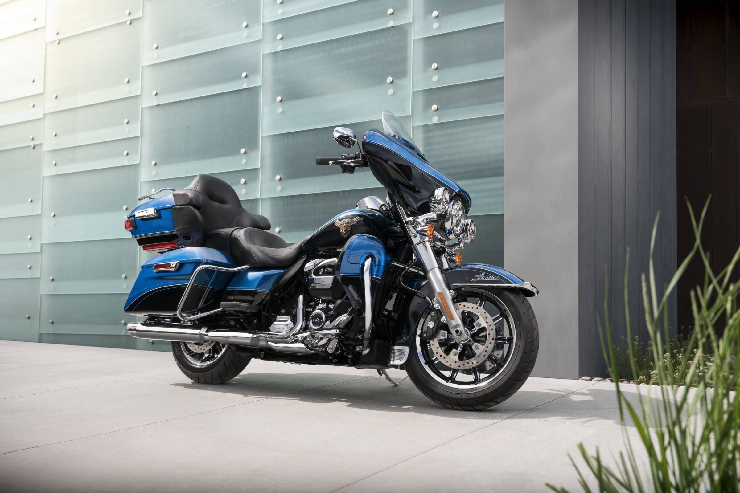 Este modelo Touring edición aniversario de la Ultra Limited 2018 se caracteriza por sus colores “Legend Blue” y “Vivid Black”, que mediante un esmalte alveolado ofrece en el tanque de combustible un águila sosteniendo con sus garras el escudo Harley-Davidson.