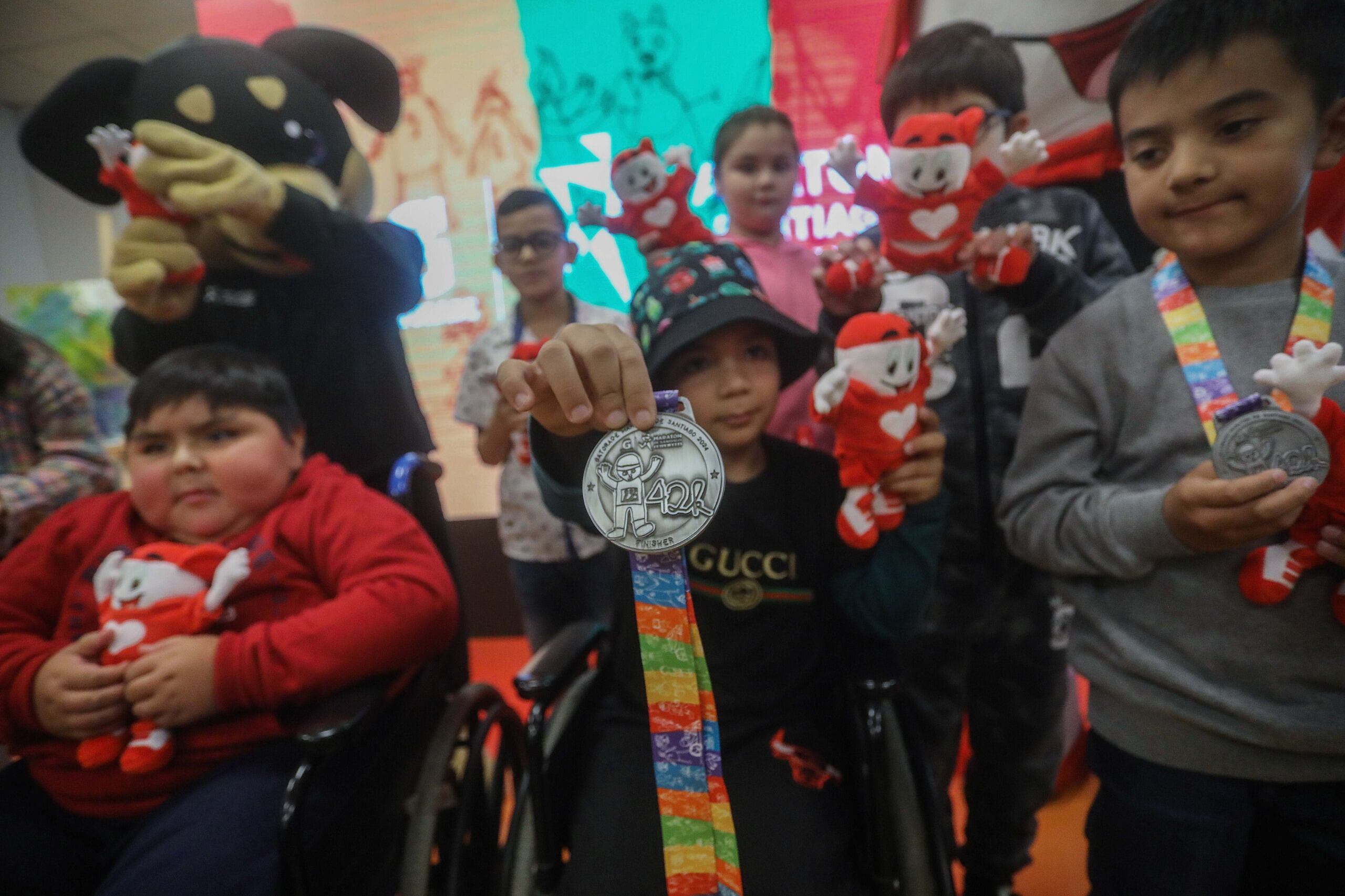 Las medallas fueron diseñadas en el taller de arte de Teletón Santiago en un trabajo colaborativo con los organizadores del maratón, quienes contaron a los niños y niñas la historia de este evento deportivo y lo que significa participar del mismo.