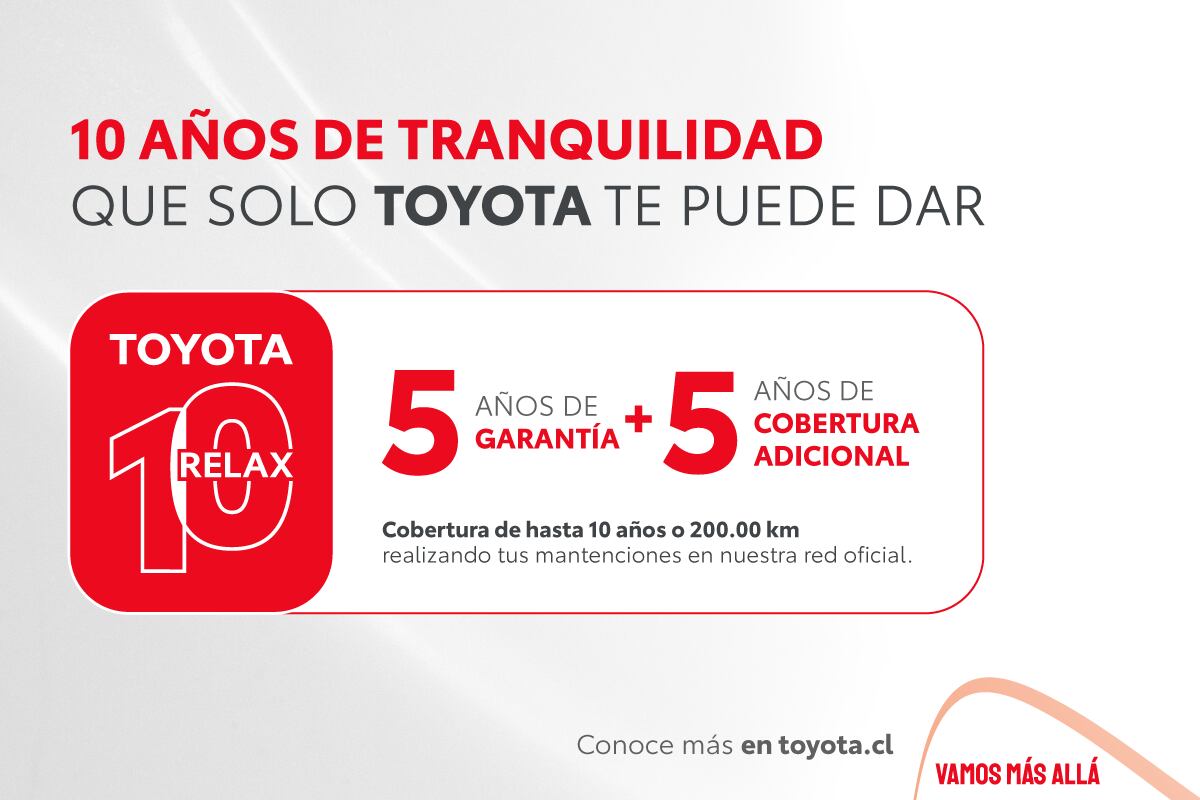 El programa TEN RELAX representa un significativo avance en los beneficios para los clientes de la marca, ya que suma 5 años adicionales a la garantía de fábrica estándar de 5 años que ya ofrecen los vehículos Toyota. Esta cobertura aplica para toda la gama de modelos importados y comercializados oficialmente en Chile, con excepciones únicamente para unidades destinadas a usos especiales o comerciales específicos.