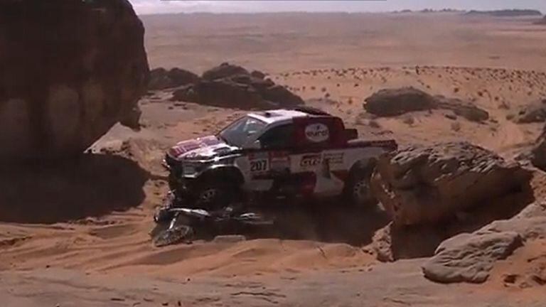 “Estuvimos involucrados en un incidente con el motociclista N° 106. Mientras subíamos por un tramo muy difícil y empinado, estrecho y rocoso, nuestro auto fue inclinado a la izquierda por una roca, lo que nos hizo golpear la espalda del motociclista 106, haciéndolo caer al suelo”, partió expresando el campeón del Dakar 2009.