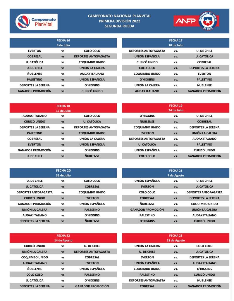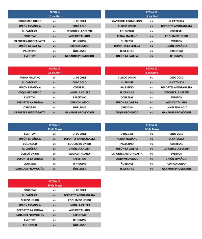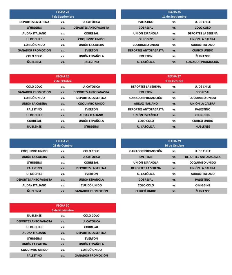 El ente rector del futbol chileno dejó liberado el mes de junio, donde seguramente se jugarán las primeras llaves de la Copa Chile. Por otro lado, en la programación aparece el “ganador de la promoción”, todo a la espera de quien resulte vencedor de la liguilla entre Huachipato y Copiapó