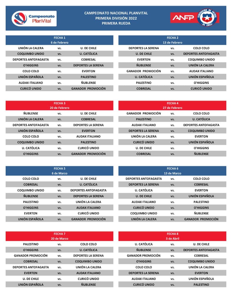 A pesar que aún no se definen completamente los 16 equipos que serán parte del Campeonato Nacional del 2022, la ANFP lanzó el fixture de todo el año es decir, las 30 fechas a disputarse. La novedad es que el torneo está diseñado para finalizar la primera semana de noviembre, entendiendo que el mundial de Qatar comienza el 21 del mismo mes.