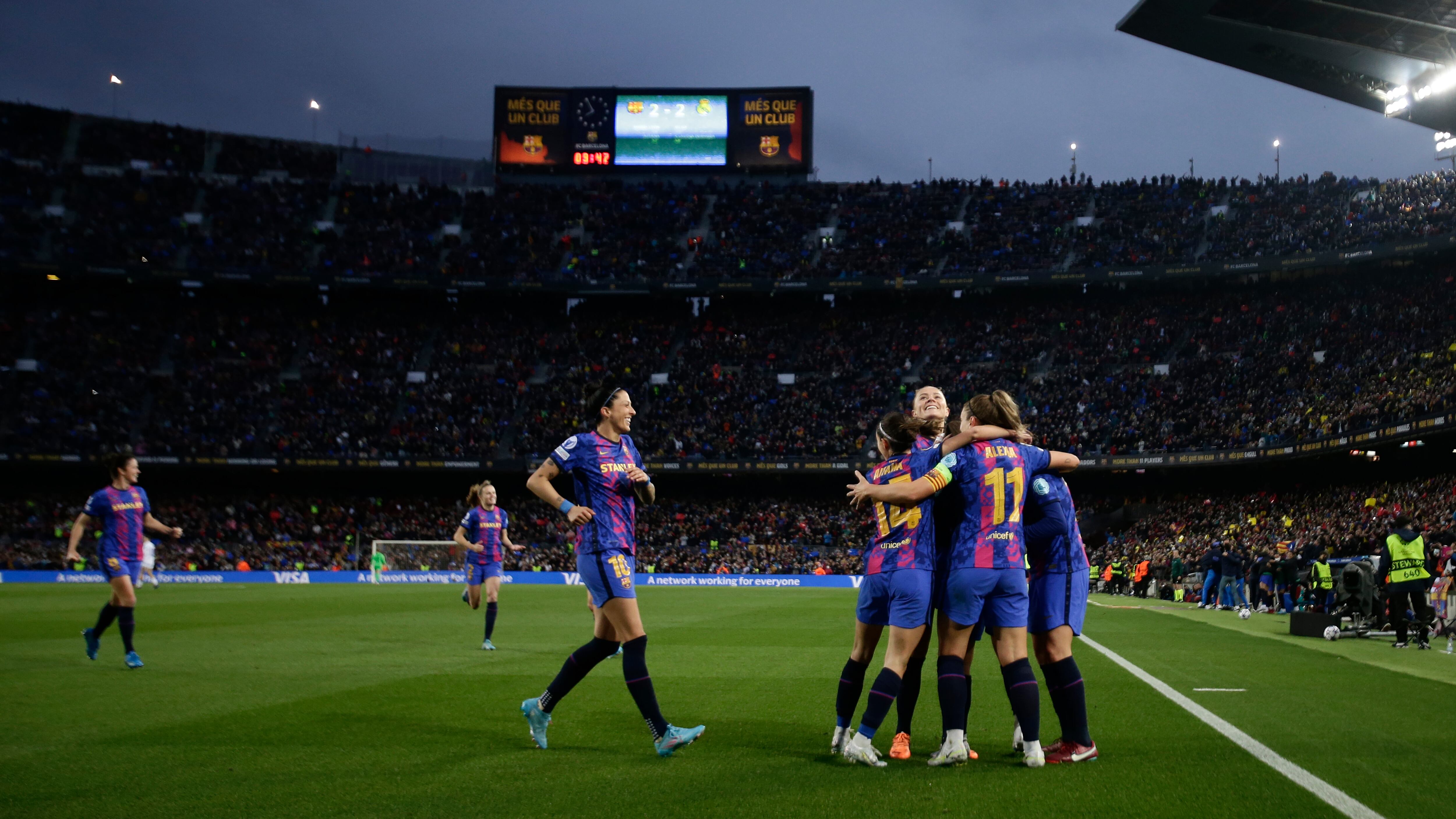 Una concurrencia récord para un partido de fútbol femenino que superó los 91.000 espectadores presenció el miércoles al Barcelona derrotar 5-2 al Real Madrid en los cuartos de final de la Liga de Campeones en el estadio Camp Nou.