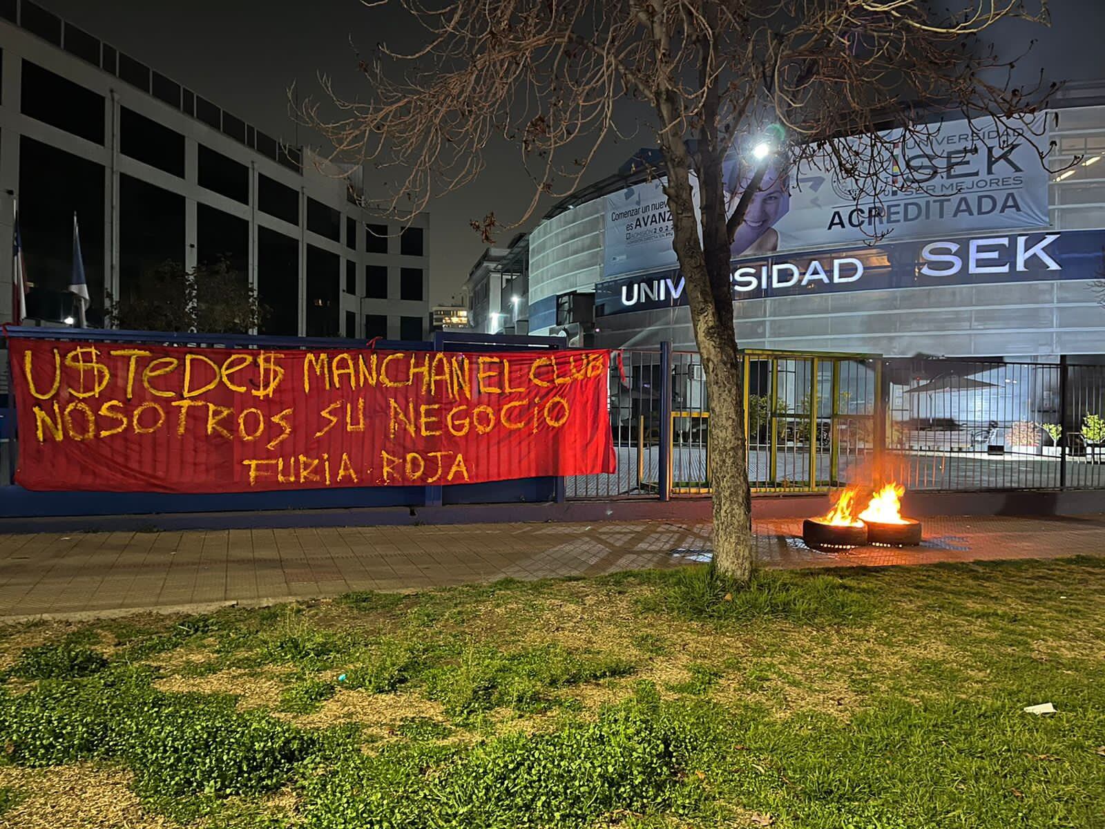 La “Furia Roja” instaló barricadas y un lienzo con la consigna “¡Ustedes manchan el club, nosotros sus negocios!”, en la sede central de la Universidad SEK ubicada en la comuna de Providencia.