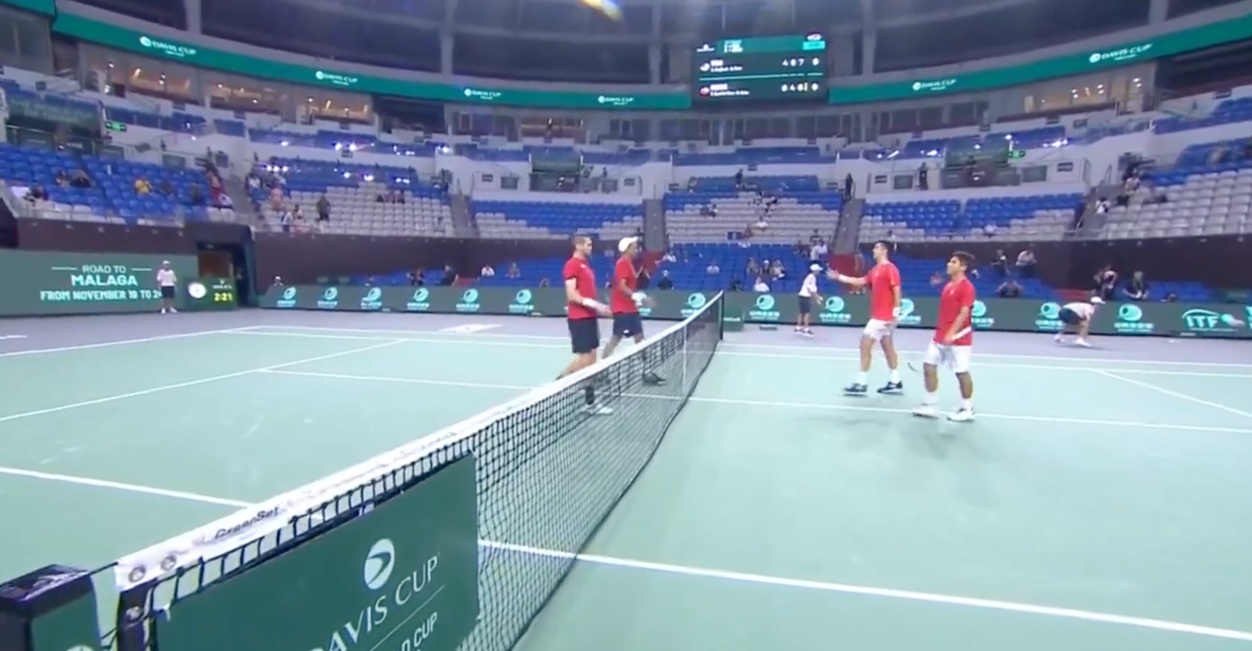 Finalmente, y con la serie totalmente perdida, se disputó el dobles donde Chile tenía la opción de obtener puntos, pero la dupla de Tomás Barrios y Matías Soto terminó cayendo ante Austin Krajicek y Rajeev Ram por 6-4, 4-6 y 6-7 (3).