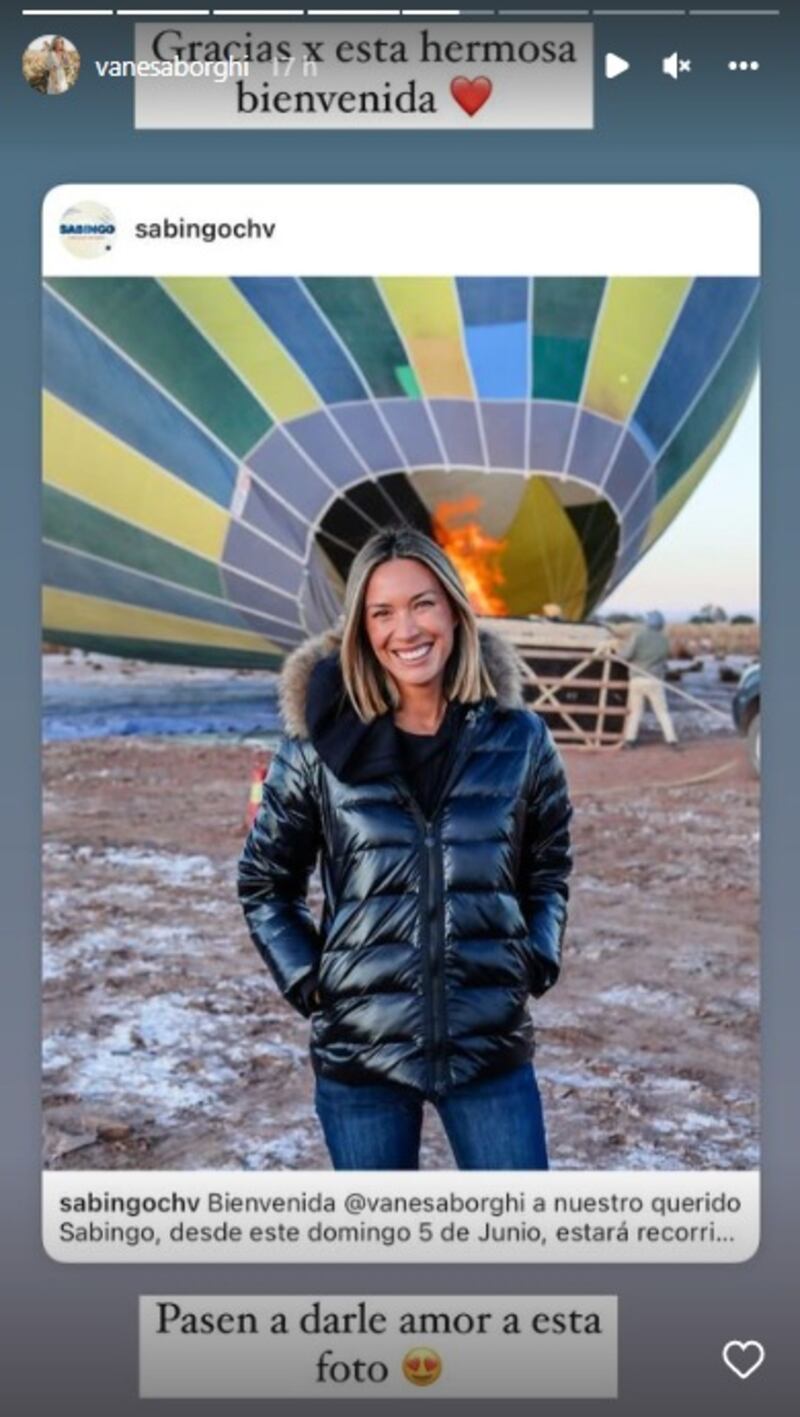 “Fabulosa la experiencia (...) ¿se han subido a un globo aerostático? La sensación de estar flotando, de poder observar todo tan suavemente a 3.000 metros de altura es mágico. Esto es algo que verán pronto en @chilevision”, reveló la transandina, quien desde este viernes será la conductora del bloque “La ruta verde”, donde promocionará un estilo de vida saludable con viajes por lugares de Chile vinculados a la naturaleza y en los que mostrará también a emprendedores y diversos restaurantes cuya carta se basa en alternativas alimenticias sanas e innovadoras.