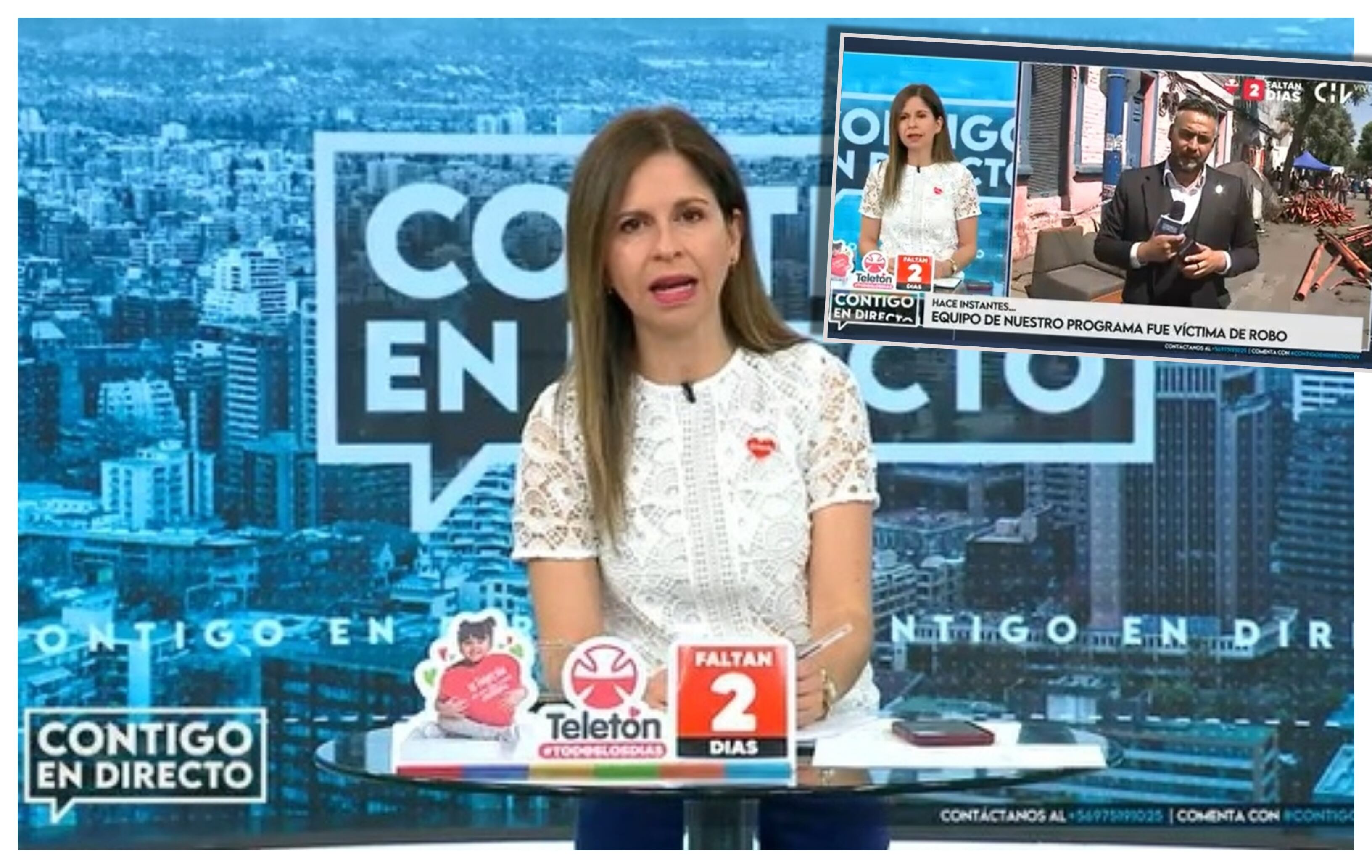 “Tenemos que contarles que uno de nuestros equipos, que estaba muy cerca del canal, al frente de la Onemi, para hablar de los incendios forestales, acaba de ser asaltado”, dijo la periodista, cuyo semblante demostraba su molestia por el hecho.