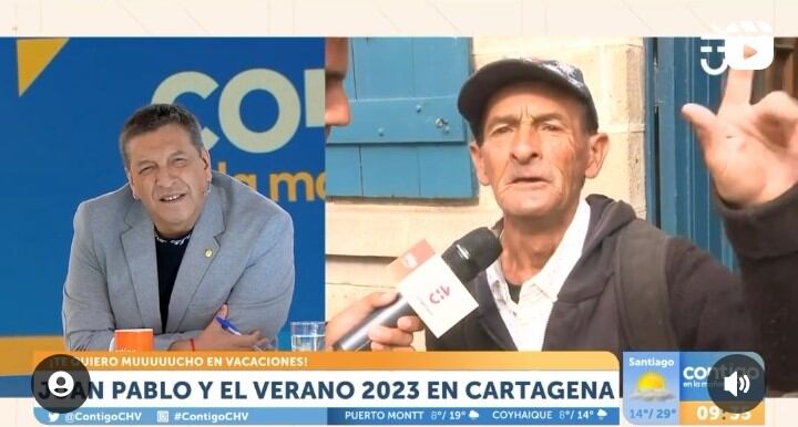 Este martes 10 de enero en el matinal “Contigo en la mañana”, Juan Pablo Queraltó realizó despachos desde Cartagena, Región de Valparaíso, donde conversó con vecinos del popular balneario. Uno que llamó la atención fue el “Poeta perdido”, según informa Página 7.