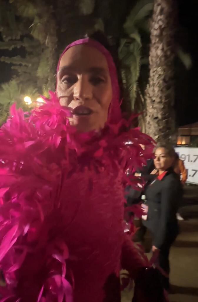 A una hora de comenzar la primera noche de Festival Di Mondo llegó todo emplumado de color rosa a presenciar el show de La Bichota. Quiso entrar raudo, pero no contaba con que la férrea seguridad del recinto de la Quinta Vergara le pidió mostrar su respectiva entrada como cualquier mortal.