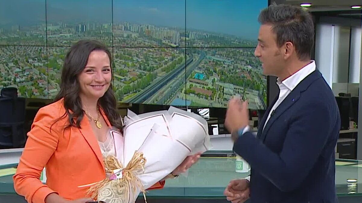 Al término de la edicion de este viernes de Meganoticias Actualiza, minutos antes de las 15 horas, Gonzalo Ramírez le regaló un ramo de rosas y dedicó una emotiva despedida a la comunicadora.