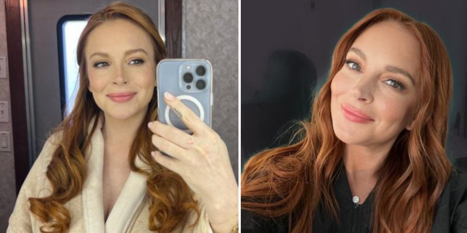 En la postal, Lindsay Lohan ya tiene una abultada pancita de embarazada que se visualiza en el selfie que se tomó frente a un espejo. La celebridad de 36 años lleva un largo vestido en color olivo con estampado en blanco y corte recto con escote en V.