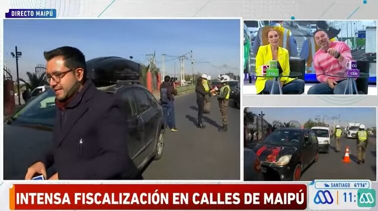 “Nosotros, muchachos. Tomamos desayuno en Puente Alto y llegamos acá, con la guatita llena. Llegamos acá inmediatamente a ser parte de esta fiscalización”, respondió el notero de “Mucho Gusto”, quien optó por alejarse de su colega, pese a los pedidos de acercarse a ella mientras entrevistaba a la capitán de Carabineros a cargo del operativo en la comuna de Maipú.