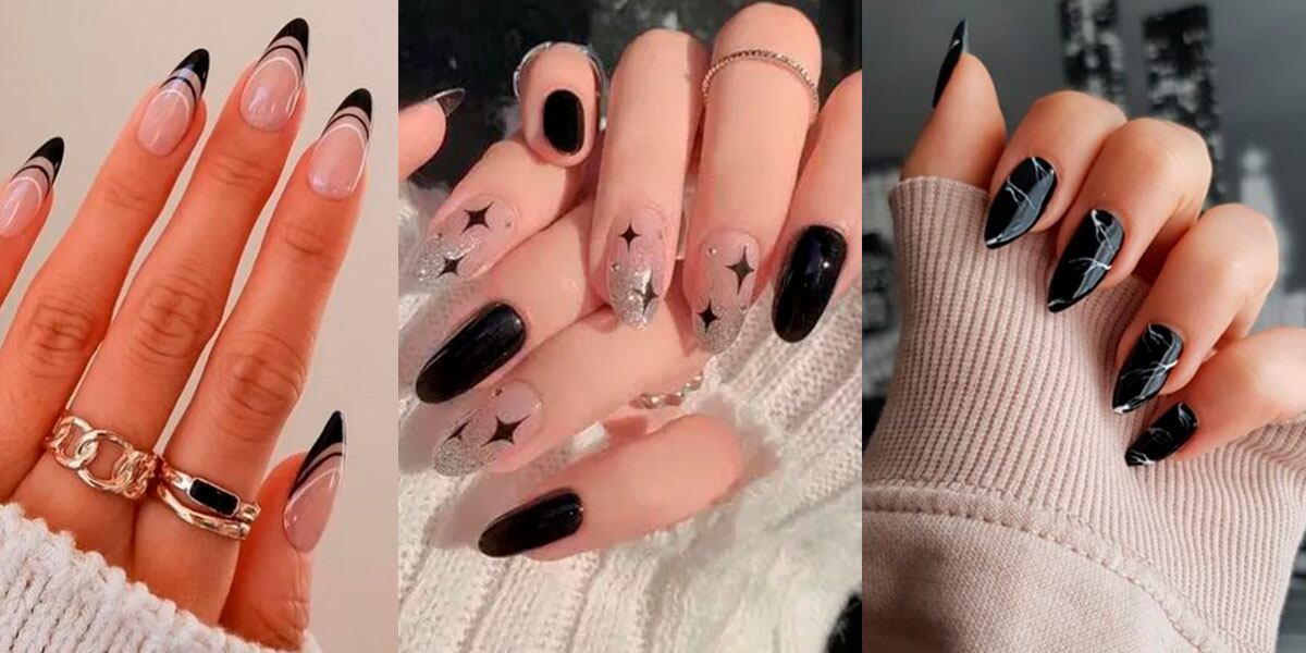 Solo aplica una base de esmalte de brillo y haz unas líneas o curvas en las puntas de las uñas en negro para que sea una manicura que combine con todo.