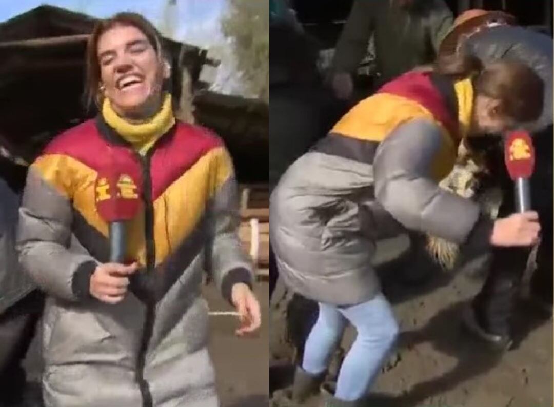 En eso estaba la animadora cuando entrevistaba a una familia que se vio muy complicada por sus animales, quienes también se vieron afectados por el temporal.