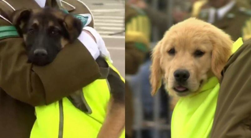 “Hacemos un llamado a la adopción y tenencia responsable, hoy estos perritos se presentan en brazos de los carabineros, para encontrar un hogar y ser parte de una familia”, se escucha decir a la locutora a cargo de la presentación.