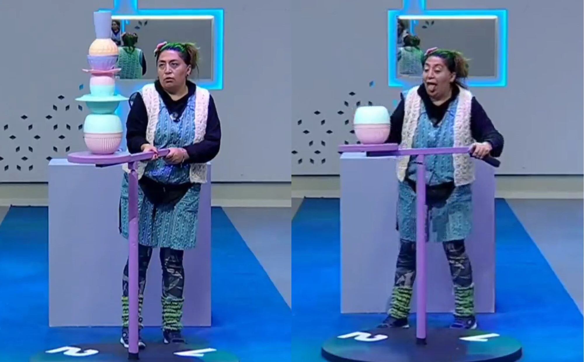 El objetivo era que cada participante apilara una serie de utensilios de cocina sobre una plataforma giratoria, teniendo como propósito mantenerlas en equilibrio por algunos. Sin embargo, estas habilidades le fallaron a la chilota.