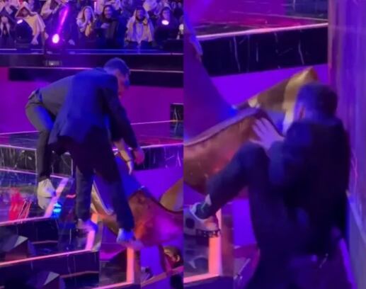 Fue justo en ese instante que Karol se cae de la silla y se va de espaldas al piso. Pero, eso no sería todo, porque al momento de querer levantar la pesada silla, su pie se resbala en uno de los escalones que son parte de la escenografía y tuvo la impactante caída de más de un metro de altura.