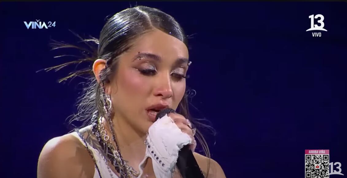 “Por eso, hoy, quiero pedir un fuerte aplauso para los y las trabajadoras de la salud, carabineros, carabineras, voluntarios, voluntarias, bomberos”, manifestó la cantante, entre lágrimas.
