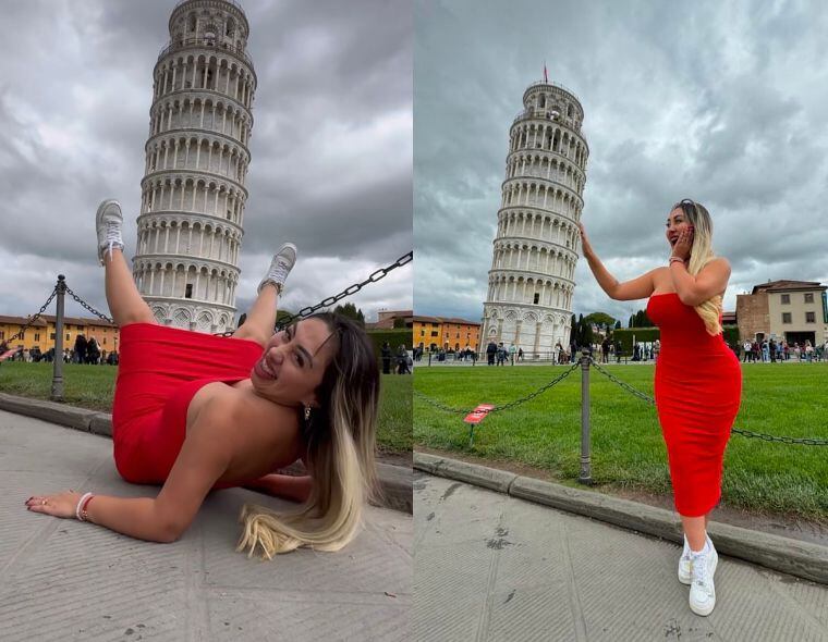 Primero se le puede ver posando con normalidad frente al monumento, sin embargo, en la segunda fotografía todo se descontroló. Este gesto causó la furia de los seguidores de la influencer, quienes la llenaron de críticas por su actuar. La joven tuvo la idea de posar frente a la “Torre de Pisa” nada menos que recostada en el suelo y con las piernas abiertas. Así lo dejó ver en una publicación que compartió en sus redes sociales.
