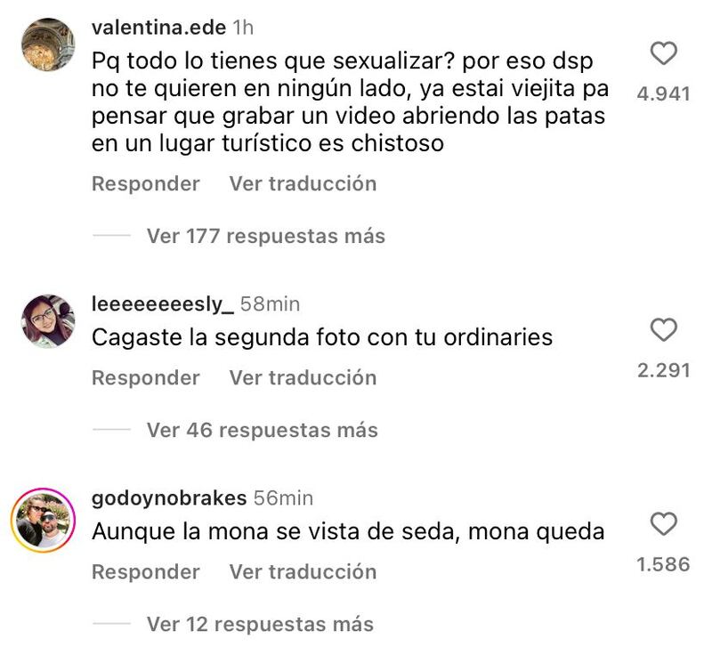 Incluso algunos se dieron el tiempo de hacerle notar su molestia. “Por qué todo lo tienes que sexualizar? por eso dsp no te quieren en ningún lado, ya estai viejita para pensar que grabar un video abriendo las patas en un lugar turístico es chistoso”, señaló un usuario.