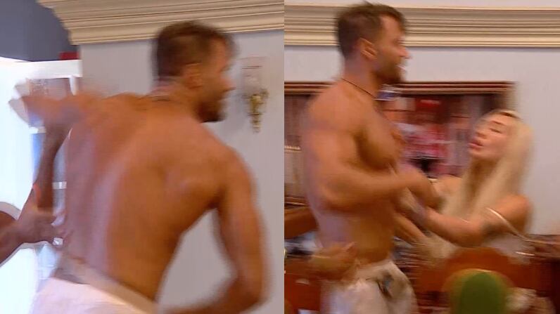 Acto seguido: las primeras imágenes de la pelea que muestran a Fabio comiendo en un extremo de la mesa de los señores, quien se paró rápidamente para ir a pelear con Luis. La pareja de Austin Palao y Fran Maira intentaron controlar a Fabio, mientras que Raimundo y Amanda se llevaron a Luis.
