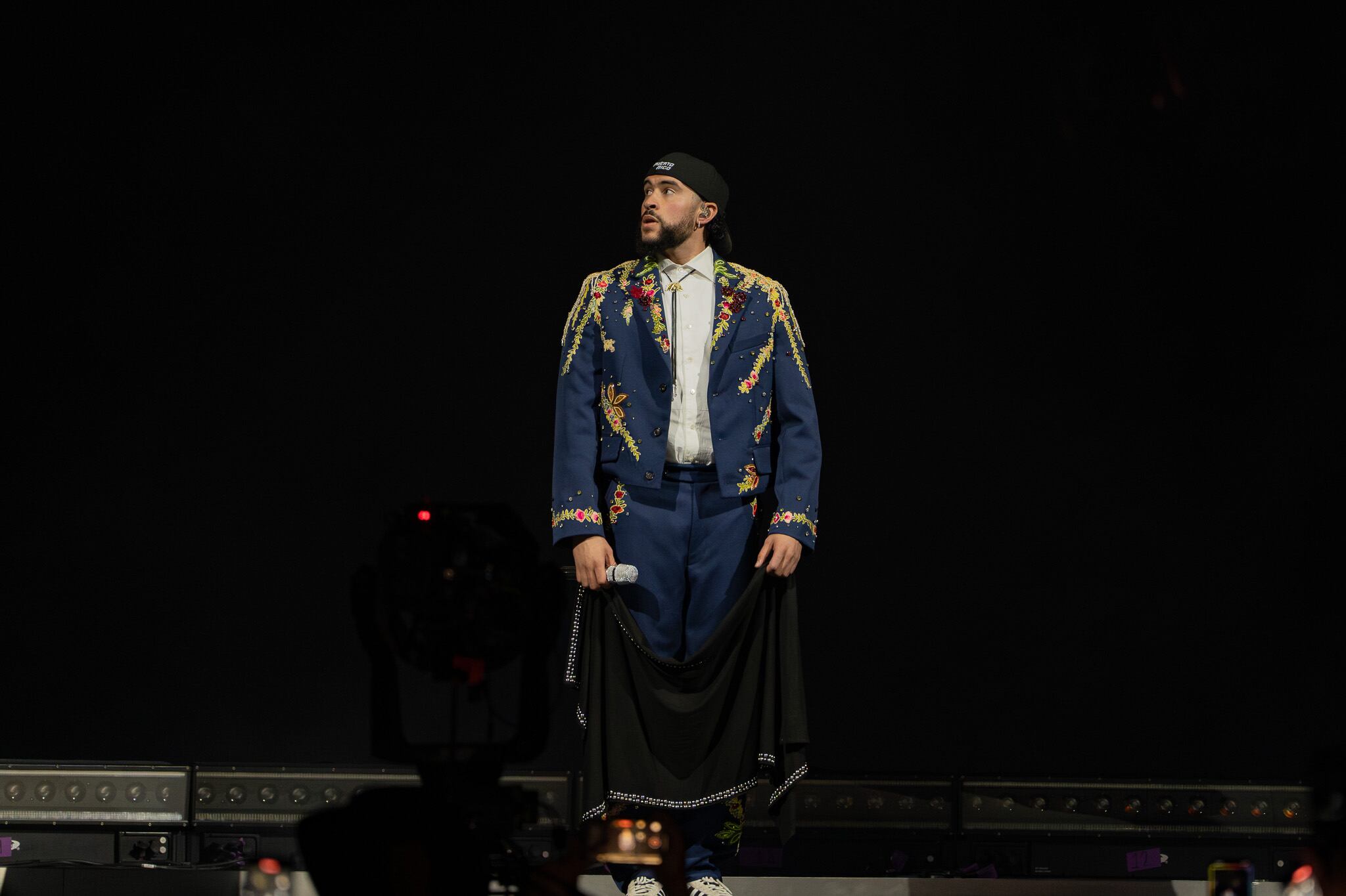 Bad Bunny pasó un incómodo momento durante uno de sus conciertos en Puerto Rico cuando el lado de la entrepierna de su pantalón quedó enganchado a la media o malla por el lado del trasero de una bailarina.