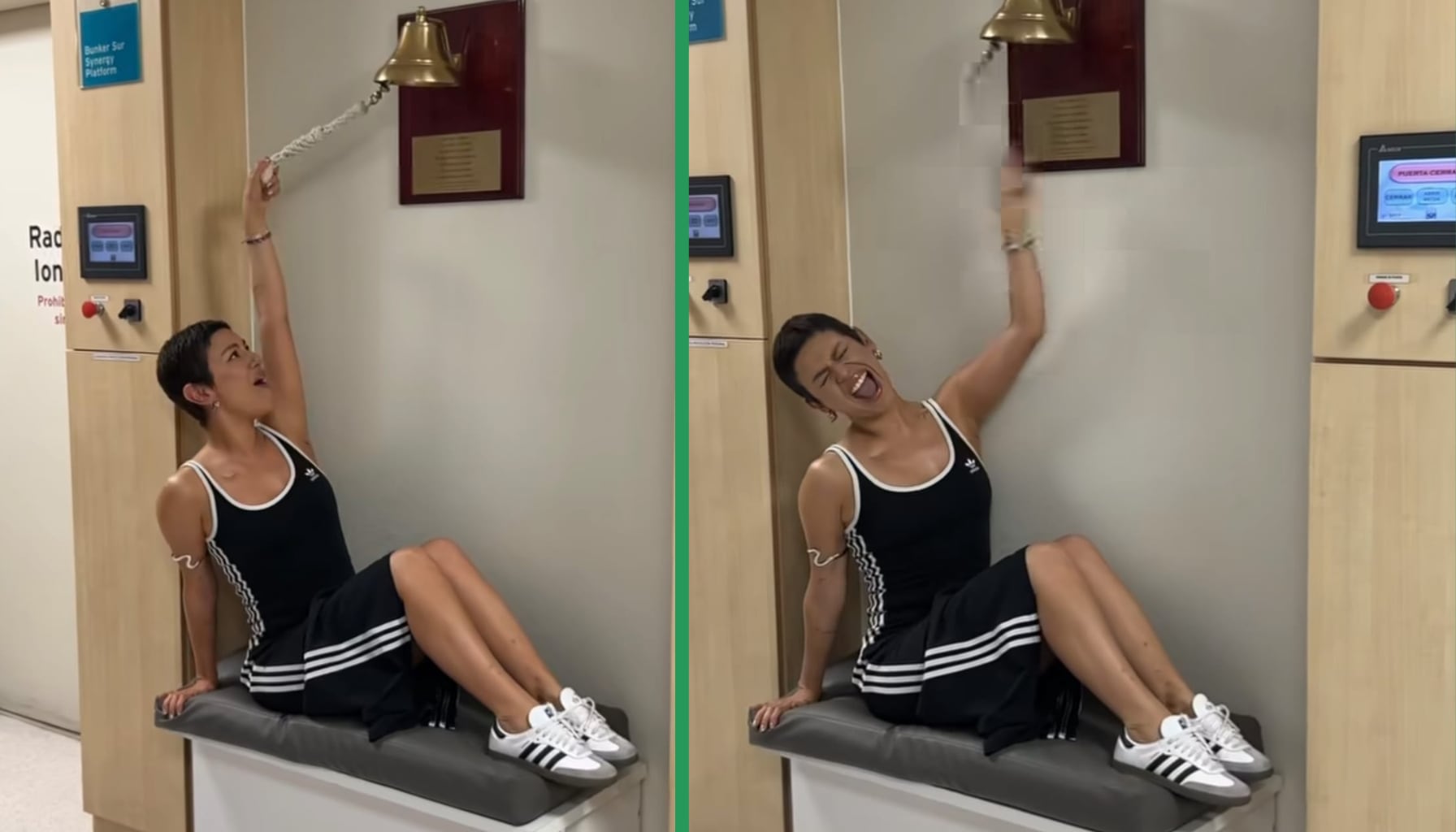 “Después de casi nueve meses, ocho quimios, una operación y quince radioterapias… aquí estoy tocando la campana de la libertad”, escribió la actriz.