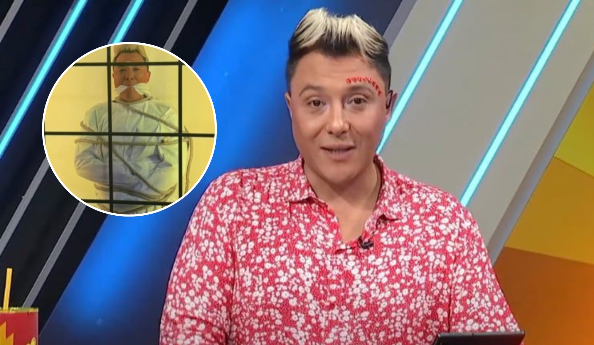 A través de su cuenta de Instagram, el conductor sorprendió al publicar una serie de imágenes de alto impacto, donde aparece amarrado, amordazado y usando una camisa de fuerza. Las fotografías, claramente realizadas como una puesta en escena, fueron acompañadas de mensajes irónicos que rápidamente captaron la atención de sus seguidores.