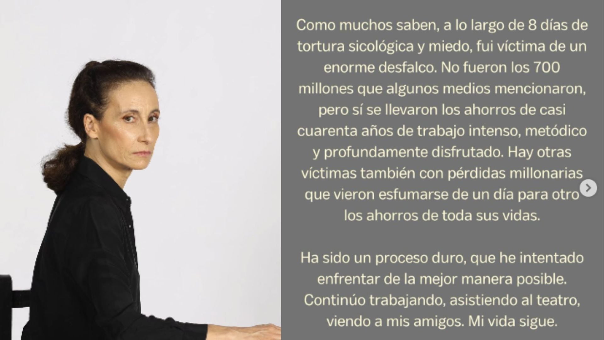 “RESPETO por favor. Como muchos saben, a lo largo de 8 días de tortura sicológica y miedo, fui víctima de un enorme desfalco. No fueron los 700 millones que algunos medios mencionaron, pero sí se llevaron los ahorros de casi cuarenta años de trabajo intenso, metódico y profundamente disfrutado. Hay otras víctimas también con pérdidas millonarias que vieron esfumarse de un día para otro los ahorros de toda sus vidas. Ha sido un proceso duro, que he intentado enfrentar de la mejor manera posible. Continuo trabajando, asistiendo al teatro, viendo a mis amigos. Mi vida sigue”.