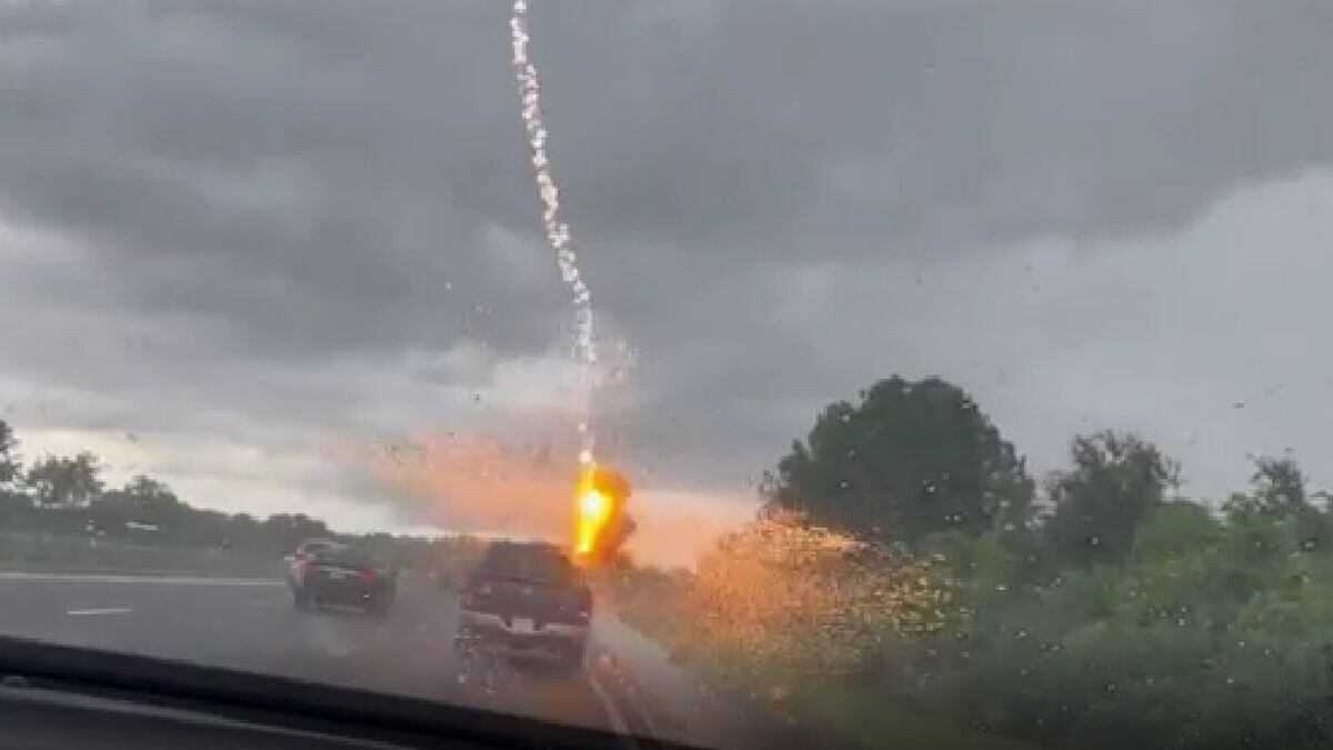 Whalen, quien captó las imágenes desde otro coche, contó que el suceso se produjo el pasado primero de julio cuando la camioneta que iba delante de ella, conducida por su esposo, con sus hijos adentro, recibió el poderoso impacto de un rayo que cayó de la nube al suelo causando un ruido estruendoso y que saltaran enormes chispas por los aires.