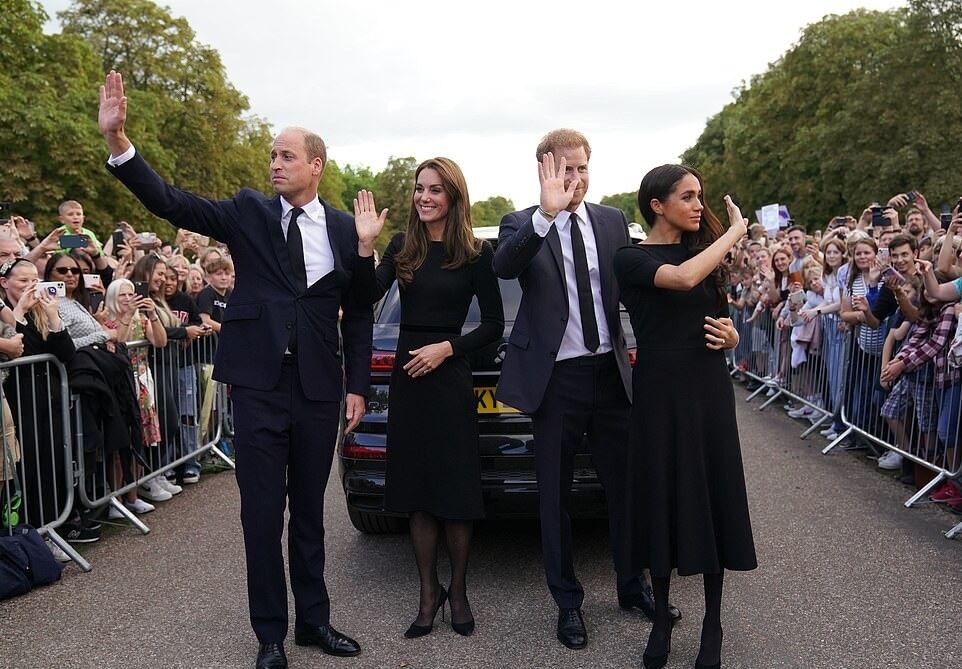 Los hijos de Diana Spencer y del actual rey Carlos III, caminaron juntos, cada uno, al lado de su esposa, en las afueras del Castillo de Windsor para ver los tributos florales en honor a la reina Isabel II y saludar al pueblo que le rendía homenaje. El cuarteto caminó, saludando a la gente.