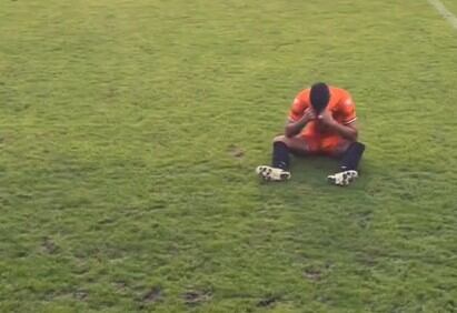 No aguantó el llanto. Se tapó la cara con la franela y se echó al suelo a llorar. Sus compañeros de equipo se acercan a consolarlo, mientras que su abuela y el resto de su familia, bajan al campo.