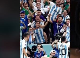 El narrador comenta que una de las cosas que más llamó la atención fue que entre el público, justo delante de Messi, había un hombre celebrando con un muñeco extraño en la mano. A pocos metros del sujeto, se ve a quien parece ser Maradona con una camiseta azul y con una gorra alusiva a la bandera de Venezuela. Está con los brazos sonrientes, festejando con los brazos hacia arriba.
