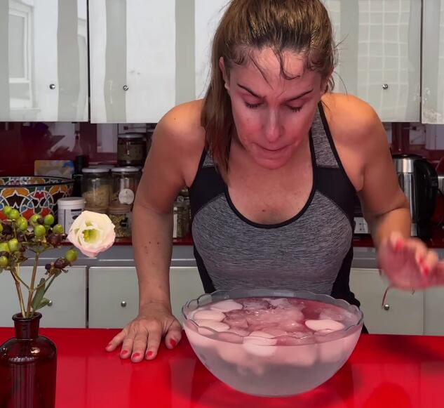 “10 segundos con la cara en una fuente con hielo para atenuar signos de envejecimiento, cerrar poros, activar circulación, reducir ojeras e hinchazón facial y alivia la piel irritada.Yo me quedé un poquito más!!! Wow es una sensación maravillosa!!!”, escribió.
