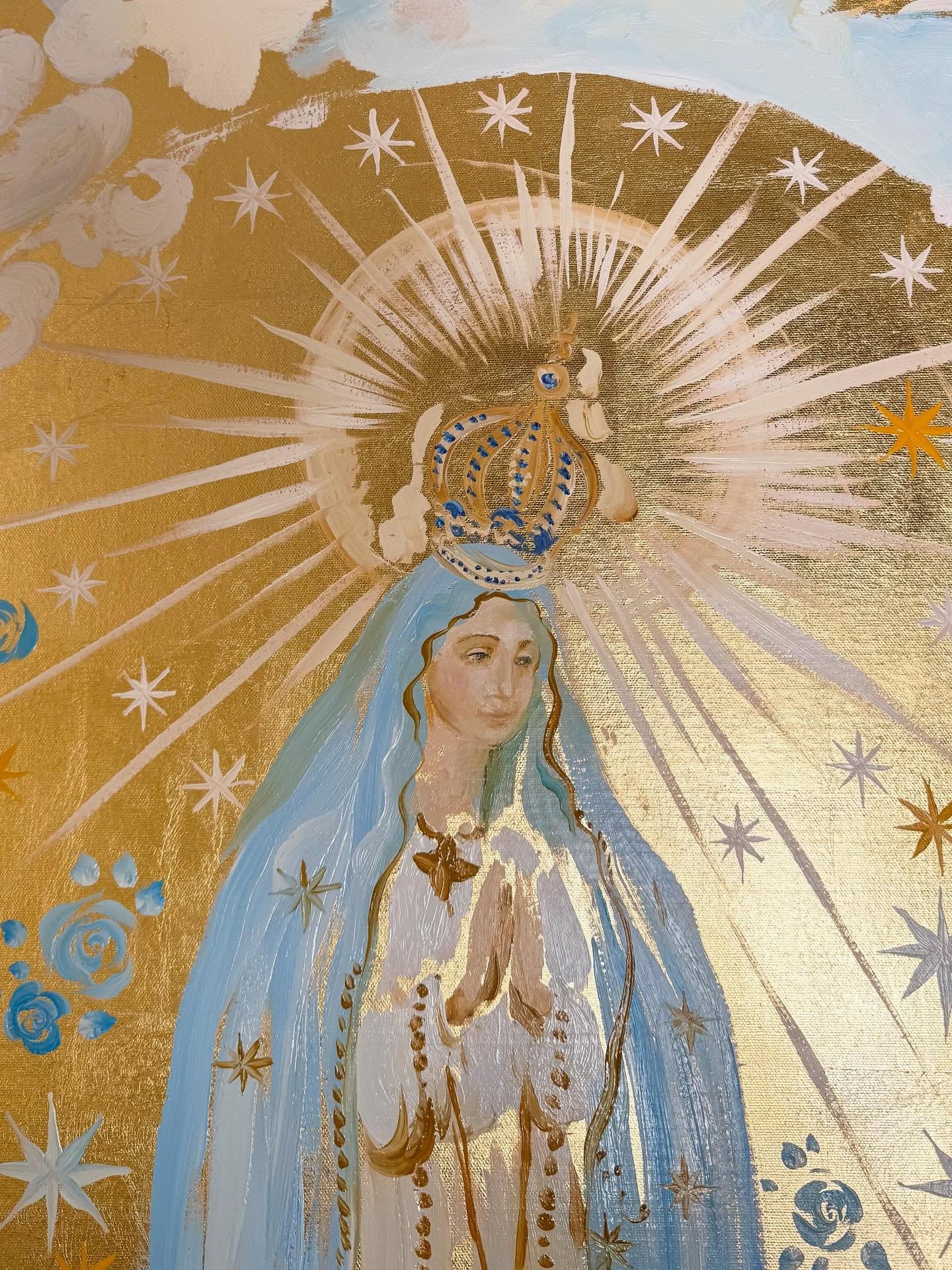A menudo aplica pan de oro a sus lienzos y ha hecho realidad su sueño de crear una serie de pinturas al óleo sobre paneles de oro puro de 24 quilates, fusionando técnicas antiguas con materiales modernos para crear obras de arte que irradian armonía y esperanza.
