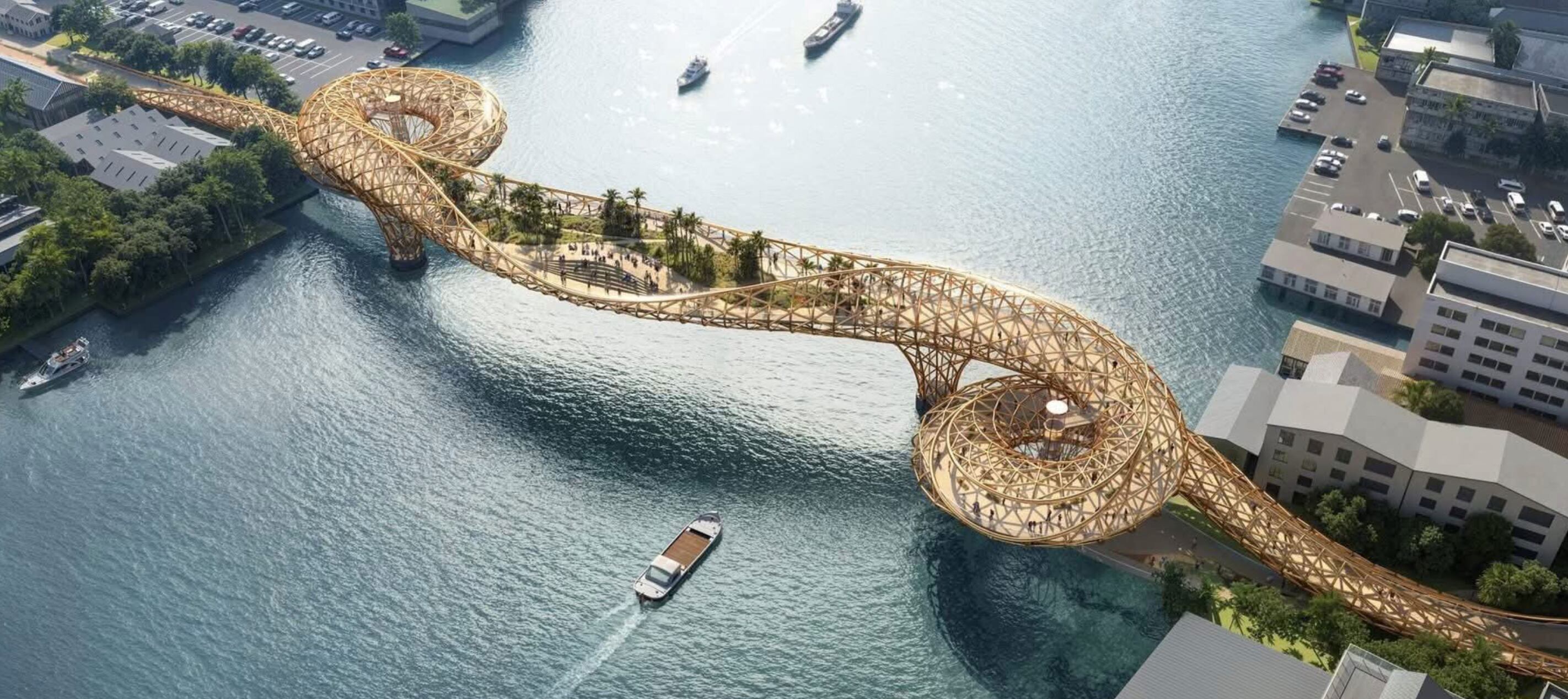 Las plataformas de madera y los asientos escalonados se integran con jardineras con vegetación tropical, transformando el cruce de una simple vía pública en un jardín elevado. Este diseño enfatiza una experiencia fluida, que combina la circulación con momentos de descanso y conexión con el entorno fluvial que se encuentra debajo.