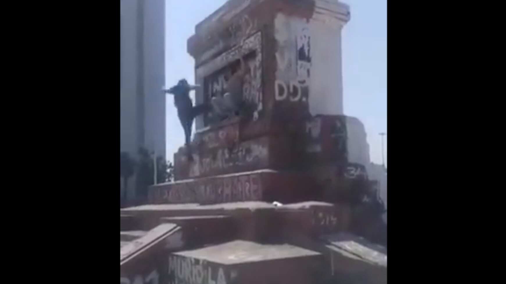 Pero en ese contexto, un sujeto intentó subir a la cima de la estructura que soportaba la estatua de Baquedano, sufriendo una brutal caída.