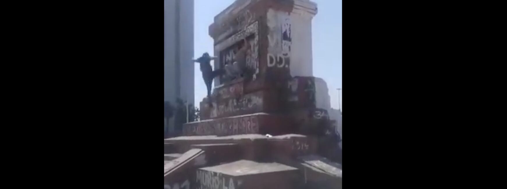 Pero en ese contexto, un sujeto intentó subir a la cima de la estructura que soportaba la estatua de Baquedano, sufriendo una brutal caída.
