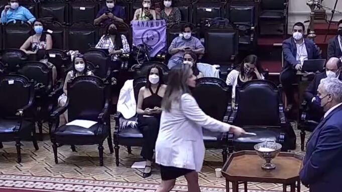 Primero fue captada en medio de la sesión sin el tapabocas y luego, cuando debía depositar su voto, le llamaron la atención por no tener bien puesta la mascarilla y hasta pifias sacó.