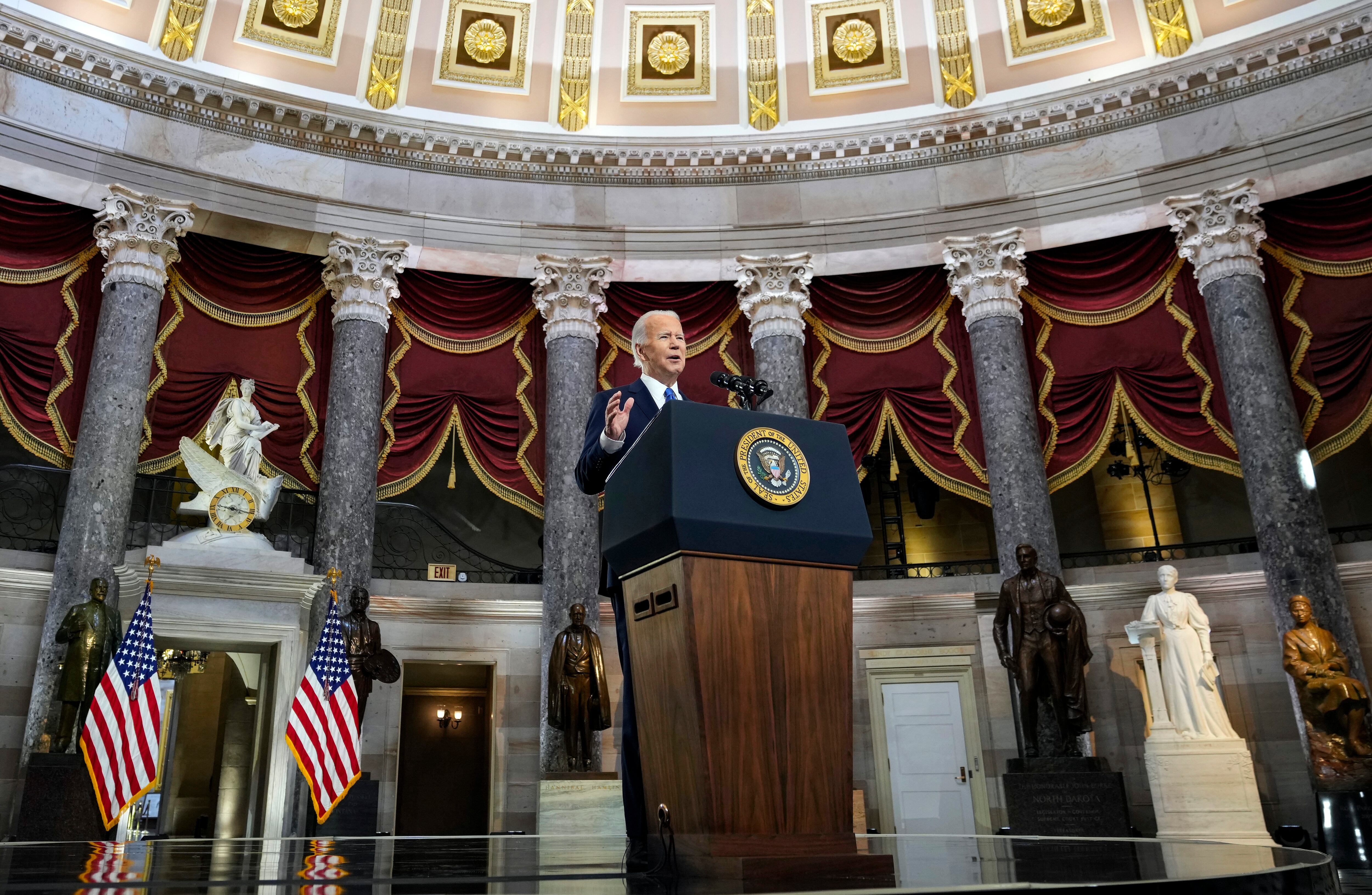 Por momentos levantando la voz hasta llenar la Sala de las Estatuas que los agresores tomaron por asalto, el presidente llamó a los estadounidenses a recordar lo que vieron el 6 de enero con sus propios ojos: una turba que atacaba a policías y rompía ventanas, una bandera confederada dentro del Capitolio, horcas afuera del recinto con la amenaza de colgar al vicepresidente, todo esto mientras Trump veía los disturbios por televisión desde la Casa Blanca.